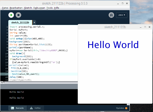 | Im ersten Beispiel wird ein Text vom Arduino über die Serielle Schnittstelle in Processing ausgegeben. | |||