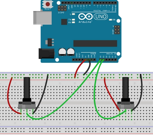 Zwei Potentiometer werden an den Arduino angeschlossen. Die Werte werden in der Processing-Umgebung als