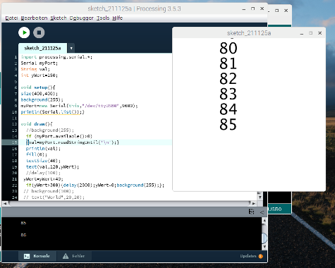 anzeigen lassen und den benötigten Port einfügen. import processing.serial.*; Serial myPort; // Serielle Schnittstelle definieren printArray(Serial.list()); |