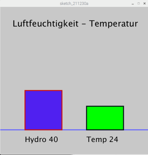 | Die Werte für Temperatur und Luftfeuchtigkeit (DHT11) werden als Säulendiagramm in der Processing-Umgebung variabel angezeigt. Der Code für die Processing-Umgebung kann fast genau so wie beim Potentiometer-Code übernommen werden. Lediglich der Text muss entsprechend geändert werden. Zusätzlich wurde die Erstellung der Säulendiagramme verändert. Diese Lösung sieht einfacher aus als bei der Potentiometerwerte-Darstellung aus. | |||
