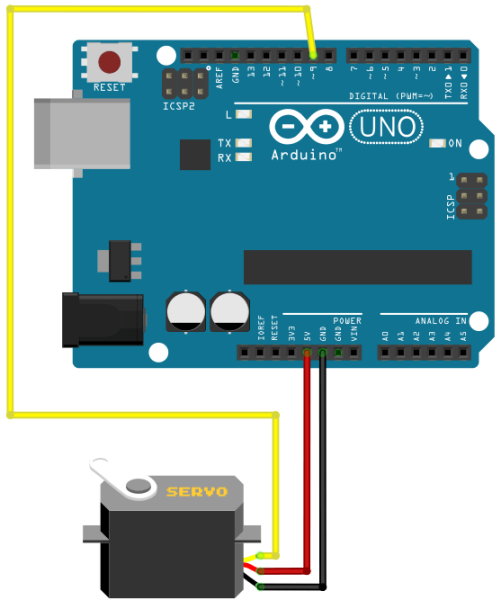 | Mit Hilfe eines Sliders wird ein Servo gesteuert. Das Programm aus Processing, um die LED zu steuern, kann ohne Änderungen übernommen werden. | |||