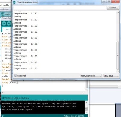 Mit diesem Sketch wird ein float-Wert übertragen Programm-Code für den Sender #include <SPI.h> #include <nRF24L01.h> #include <RF24.h> //Erzeugt ein RF24 Objekt RF24 radio(9,8); // CE, CSN //address through which two modules communicate. const byte address[6] = "00001"; void setup(){ radio.begin(); //set the address radio.openWritingPipe(address); radio.setPALevel(RF24_PA_MAX); //Set module as transmitter radio.stopListening();} void loop() { //Send message to receiver float temperature = 12.9; radio.write(&temperature, sizeof(float)); delay(1000);} |