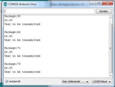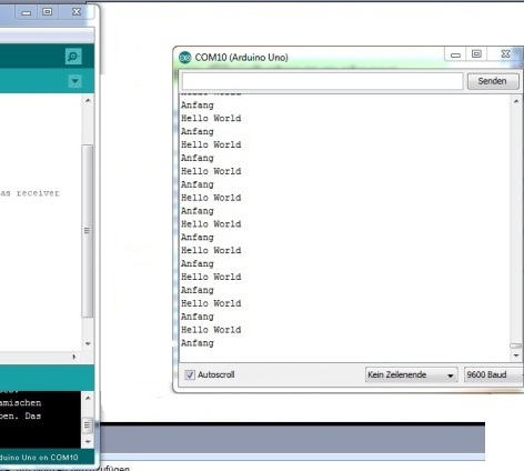 In diesem Fall wird der Text Hello World übertragen. Achtung: Der Empfänger-Arduino bleibt am PC, um den Monitor der Arduino-IDE aufrufen zu können. Der Sender-Arduino wird nach dem Aufspielen des Sketch vom PC getrennt und mit einer Batterie bzw. Akku verbunden. Hier ist darauf zu achten, dass die Spannung über 9 V liegt (es reichen dazu 6 Mignon-Batterien/Akkus = 9,6 V). Die Übertragung ist nicht immer optimal. Manchmal klappt es sofort, das andere Mal muss die Antenne anders gestellt werden. |