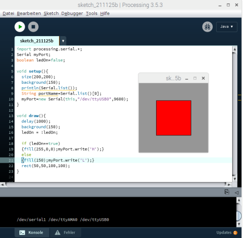 anzeigen lassen und den benötigten Port einfügen. import processing.serial.*; Serial myPort; // Serielle Schnittstelle definieren printArray(Serial.list()); |