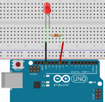 | In diesem Beispiel wird die LED aus der Arduino IDE selbstständig an- und ausgeschaltet. Gleichzeitig ändert das Quadrat in Processing seine Farbe von rot nach grau usw. Die LED ist an Pin 11 und GND angeschlossen. | |||