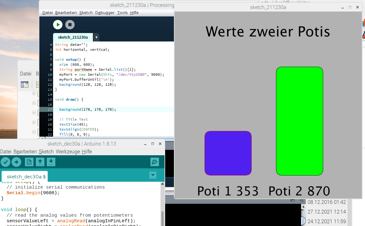 Zwei Potentiometer werden an den Arduino angeschlossen. Die Werte werden in der Processing-Umgebung als