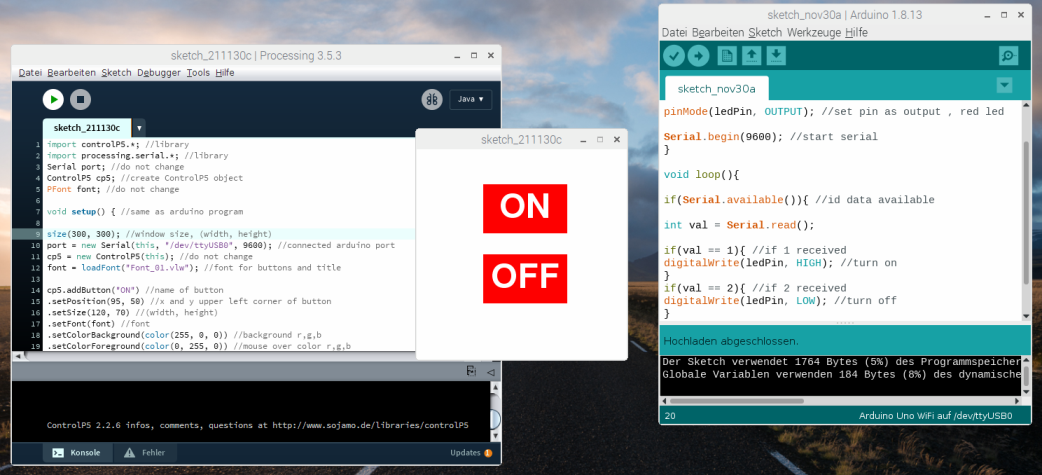 | Mit Hilfe von zwei Buttons in Processing wird eine LED ein- bzw. ausgeschaltet. Dazu muss ebenfalls wie schon oben beschrieben die Library ControlP5 installiert sein. | |||